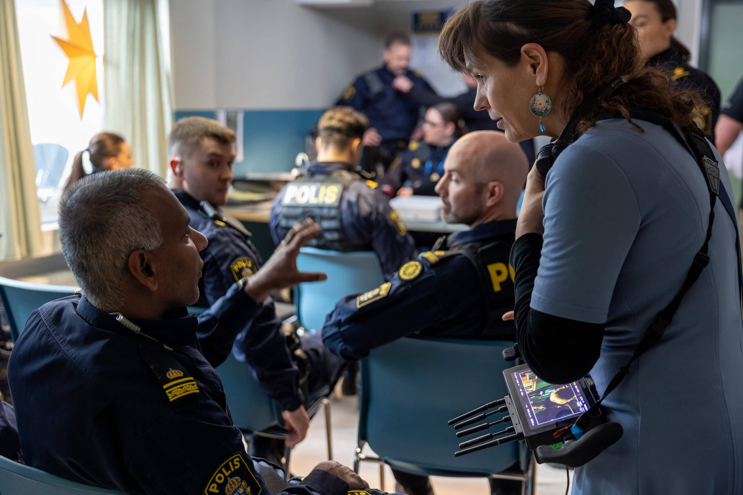 En knapp vecka före jul är filmteamet på plats i byggnaden på Södra Bulltoftavägen som inretts som en polisstation. Just i dag har poliskonsulten Linus Uppström, till vardags lärare på polisutbildningen i Malmö, gjort ett sällsynt inhopp som statist.