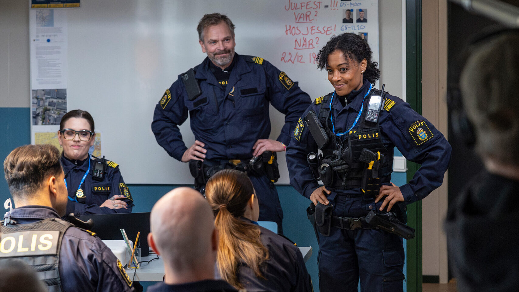 – Regissörerna har tyckt att det är roligt att poliserna alltid sitter och äter kvarg eller något på utsättningarna. Poliser äter alltid. Ständigt något mellanmål. Sedan är innebandyn ett kapitel för sig. Det har vi förklarat för Cilla som tycker att det var skitroligt med reglerna som gäller för polisinnebandy, hur djupt rotat det är och hur olika personligheter spelas ut på planen, säger Linus.
