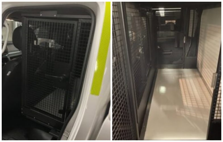 Sedan drygt ett år har hundförarna fått dispens för att placera sina hundar med sele i baksätet i stället. Men den här lösningen är bättre, säger Hannah BlomBergelin. De nya burarna kommer placeras bakom föraren. Bättre arbetsmiljö för hundarna, men även för deras förare.
